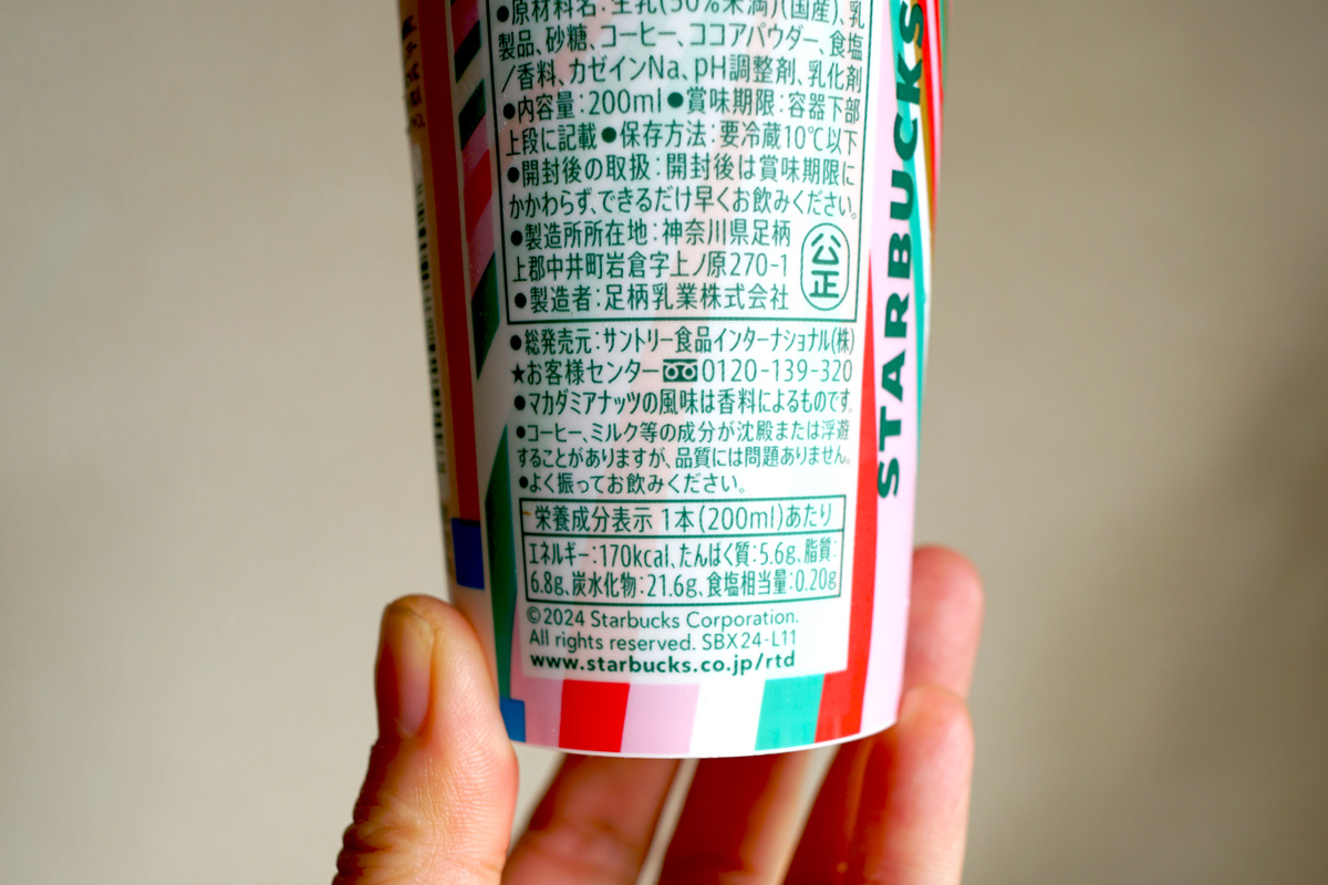 気になるカロリーはというと、1本200mlあたり170Kcalです。ミルクチョコレート味の板チョコ1枚50gが約280Kcalなので、それよりはカロリー控えめ。マカダミアナッツが香るカフェモカの味わいをしっかり堪能できる贅沢ドリンクです。