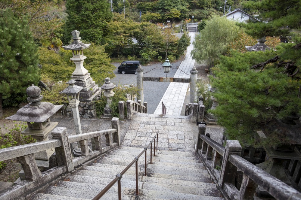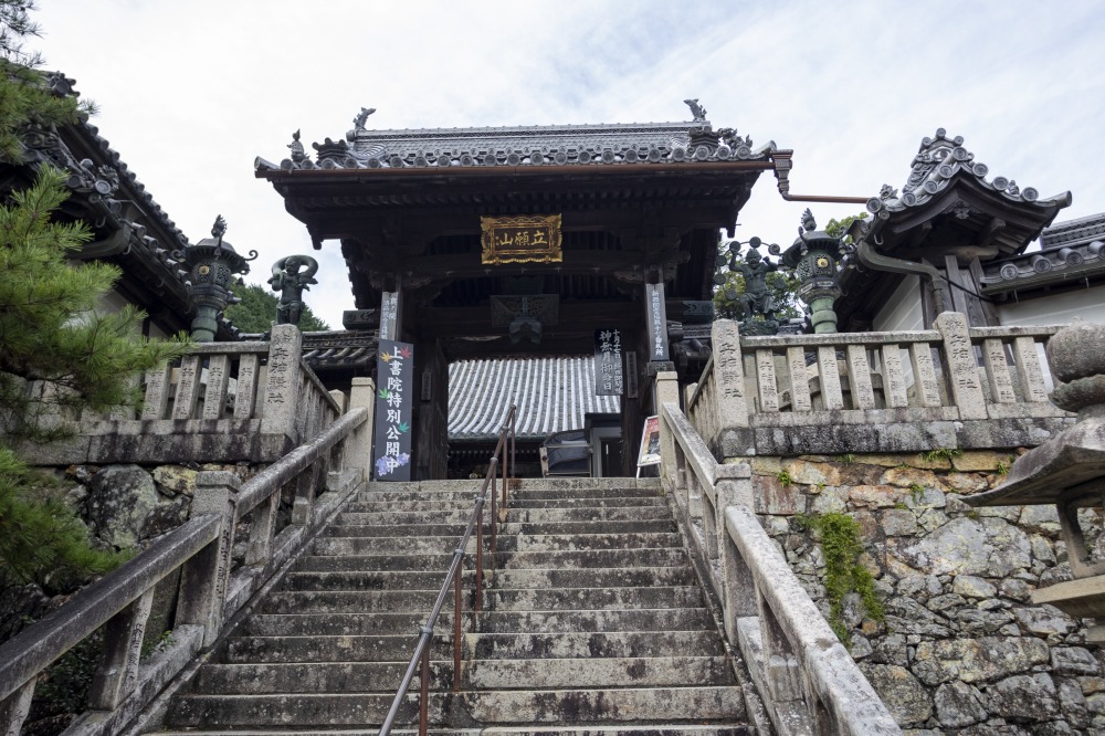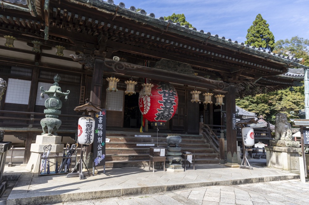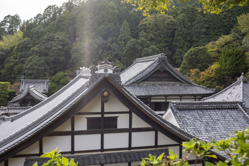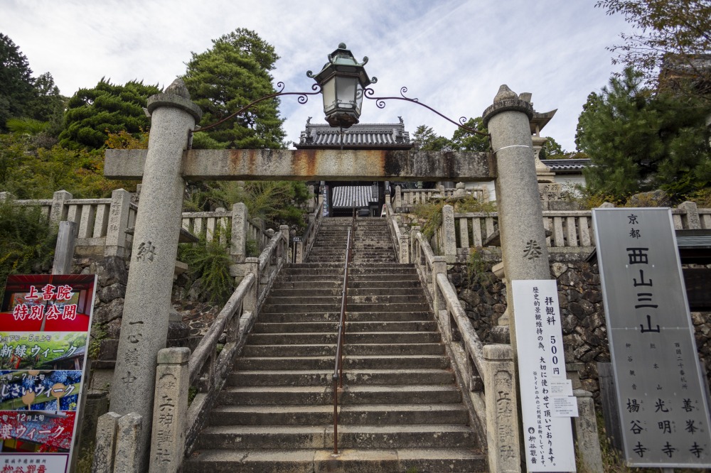 JR長岡京駅から車で15分。「本当にこの先に名刹があるの?」と不安になりつつも山道を上がると、急に視界が開けて瓦屋根の建物が並ぶ集落が目の前に。駐車場の奥には山門がそびえ、階段を上ると山寺らしい落ち着いた風情のお堂が迎えます。