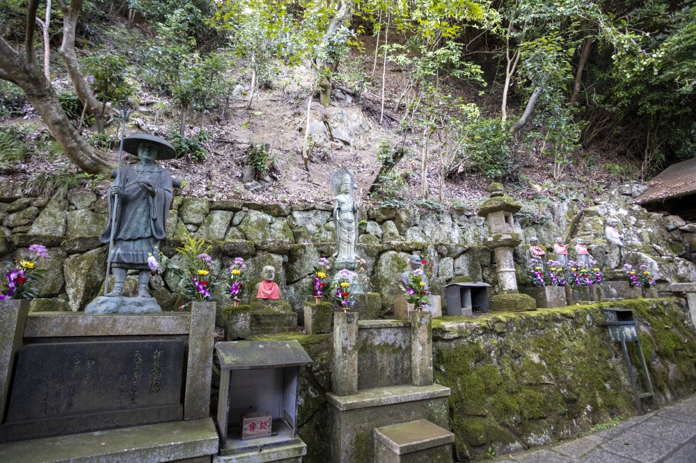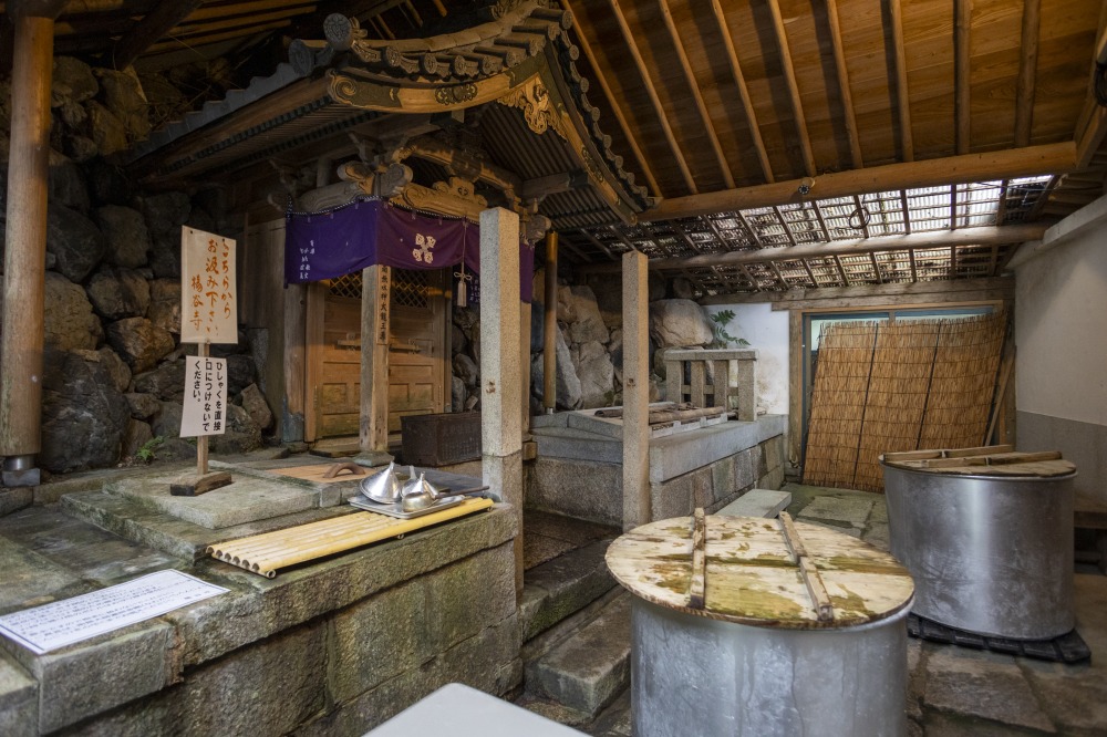 その「独鈷水」は書院のすぐ西にあり、現在も絶えることなく岩肌からひたひたと染み出ています。空海の立像とお地蔵様が並ぶ奥に岩屋戸が建てられ、水は大きな甕に溜められています。ひしゃくですくって紙コップで飲むと、ピュアで澄んだ味わい。もちろん手に取って眼などにつけても構いません。