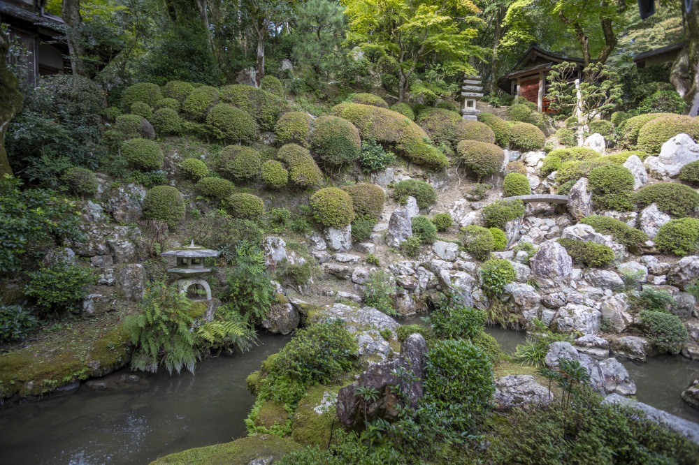 本堂隣にある庭園は「浄土苑」という名で、江戸時代中期に作庭された池泉鑑賞式庭園です。斜面に配された石は菩薩に見立てられ、阿弥陀如来や不動明王といった十三仏も安置されています。重森三玲氏により『古都百庭』にも選ばれました。