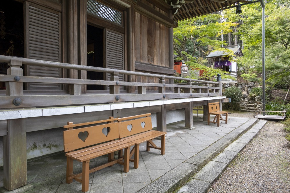 奥之院の横に置かれているベンチは、背もたれがハート型にくり抜かれ、脇には紫陽花が植えられています。このハート越しに紫陽花や山々の景色を撮影してSNSにアップする人も多いのだとか。