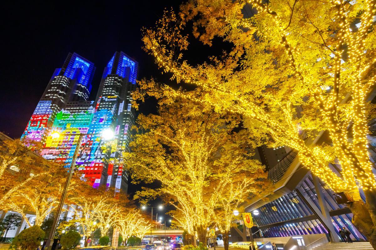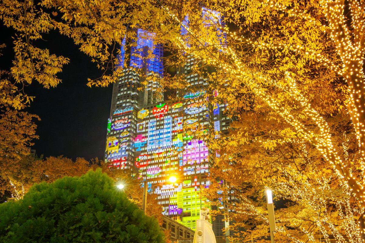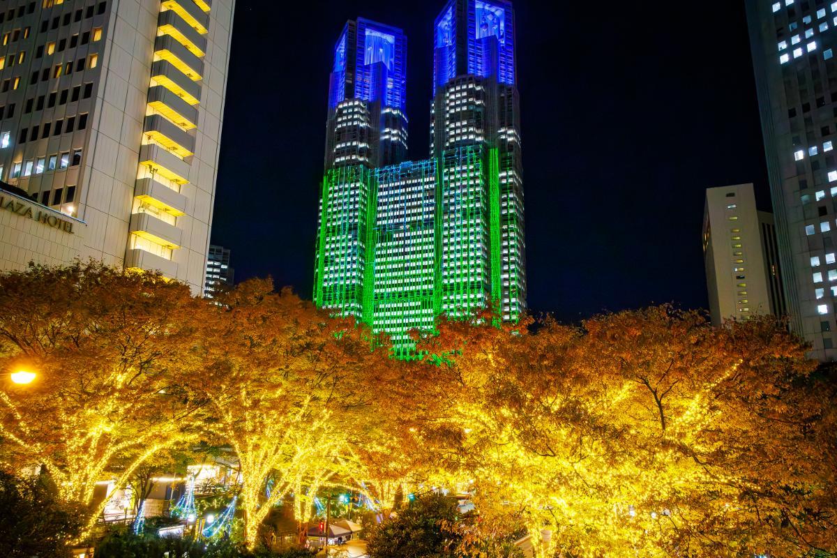 新宿住友ビルの前から南西の方角に振り返ると、都庁第一本庁舎のプロジェクションマッピングと街路樹のイルミネーションがちょうど収まるアングルに!
