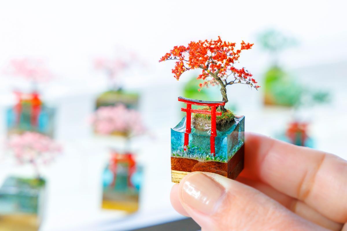 マルシェには手作りアクセサリーや布小物、着物のリメイクなどが並んでいて、作り手である作家さんが店頭で接客しているお店もありました。作品のこだわりを聞きながら、手にとって選べるのが楽しいですね。写真は「ミリプラネット」というお店で販売されていた、直径2cmほどミニチュア模型テラリウムブロック。木の幹や枝はワイヤー細工、紅葉はドライフラワーで作られ、小さな世界が繊細に表現されています。