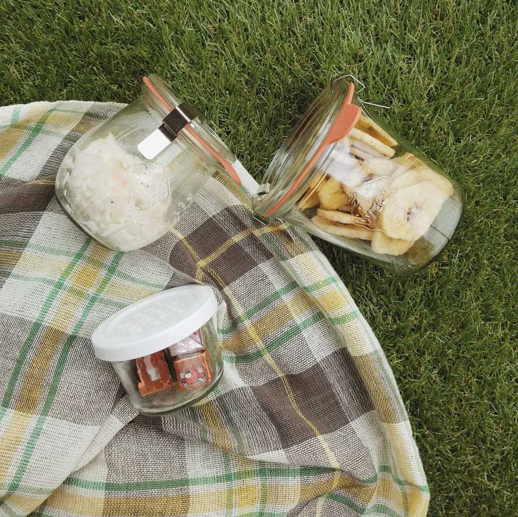 この日はコールスロー、ピクルス、チーズ、おやつのバナナチップスを保存瓶に入れてバスケットに入れました。クリップで密閉するのでお菓子が湿気ってしまう心配もありません。