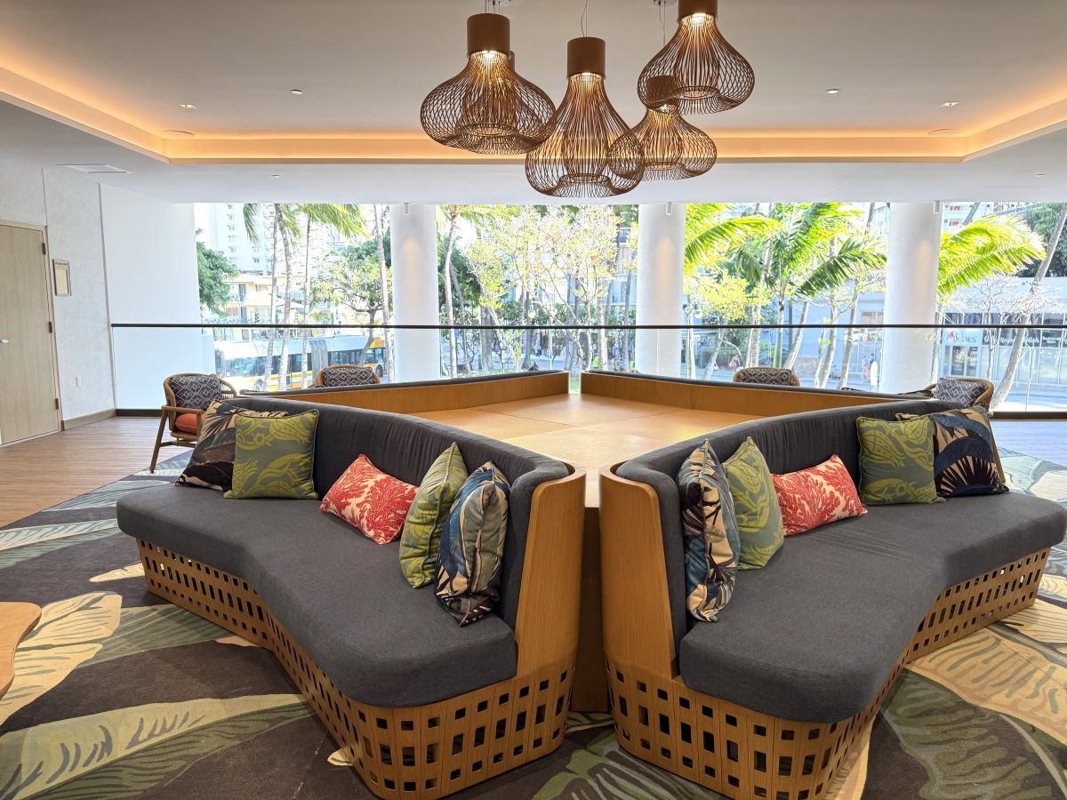 さらに、道路沿いのオープンエアエリアでは、ヤシの木が風に揺れ、ハワイの自然を感じられる設計となっています。空港から到着後、疲れた体もこのロビーに足を踏み入れれば、瞬時にハワイにきたという実感が沸くこと間違いなし! ロビー周辺にはカラフルなクッションが配されたソファや、植物をモチーフにしたカーペットなど、細部までハワイの自然を表現した工夫が施されています。