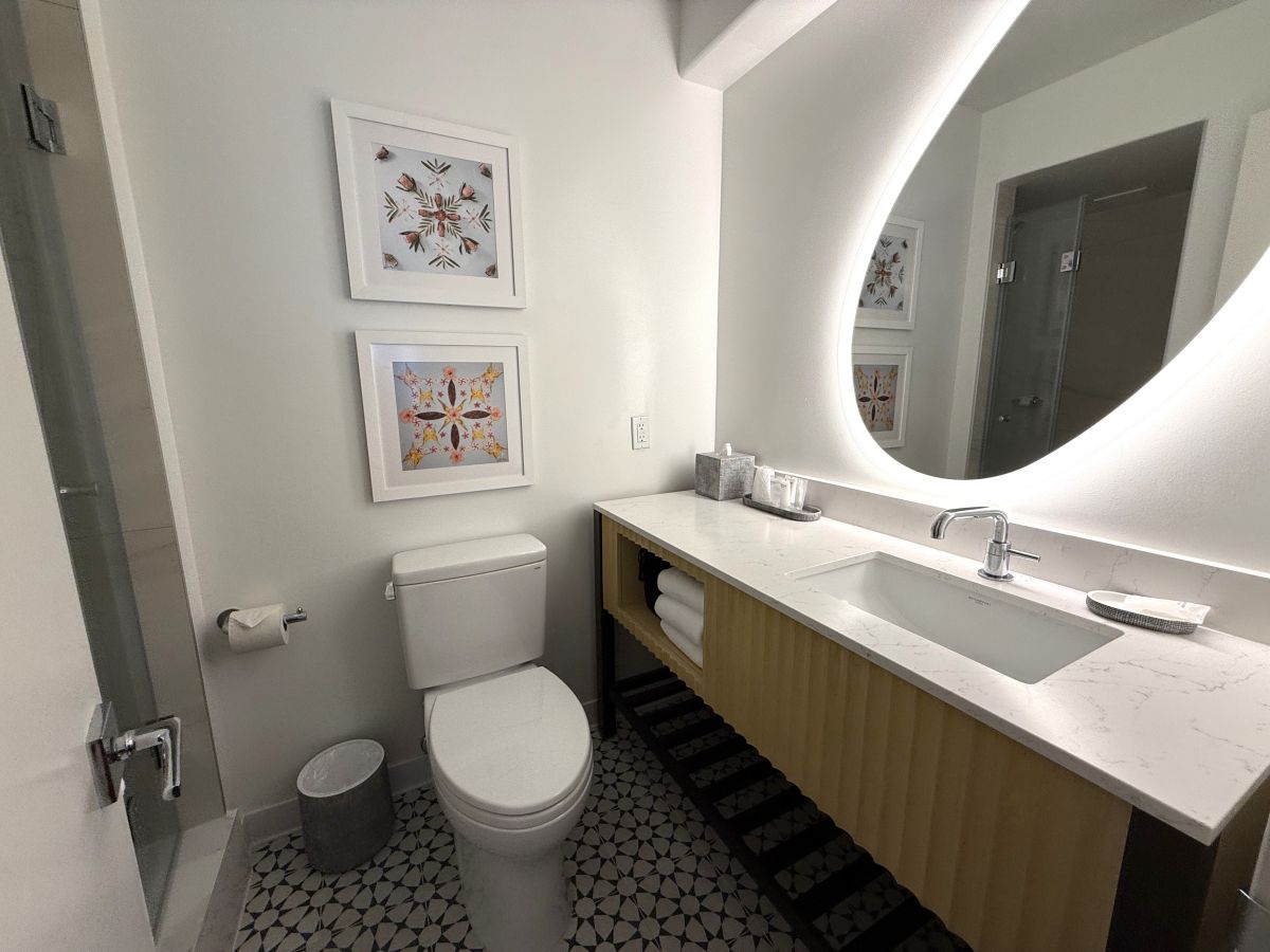 バスルームには、ロビー階でも見られる「ローラピラー・ハワイ」のお花の写真アートが飾られ、床はタイル調。そして、卵型のような鏡、清潔感溢れる木目調の棚が備わっています。シャワールームは、少し狭めの作りですが、固定シャワーとハンドシャワーの両方が備わり、使いやすい設計です。