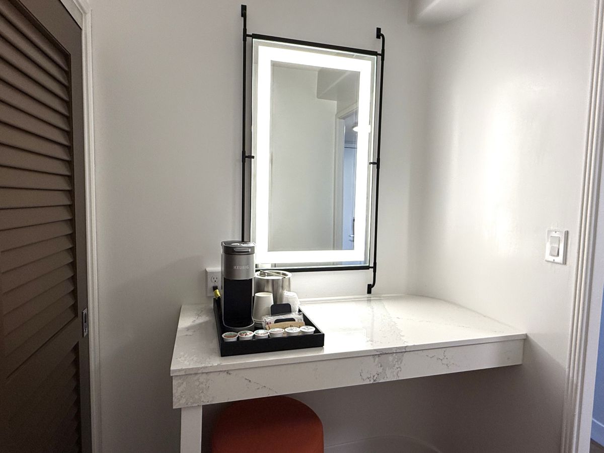 また、洗面台とは別にドレッサーも用意されているのが、特に女性には嬉しいポイント!こちらには、コーヒーメーカー「キューリグ」、と紅茶もあります。