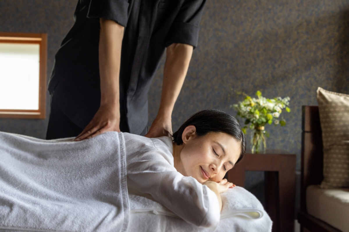 翌日のハイキングに備え、国家資格を持つ「星のや軽井沢」専属のあんま指圧マッサージ師による指圧マッサージで身体を整えてもらえます。