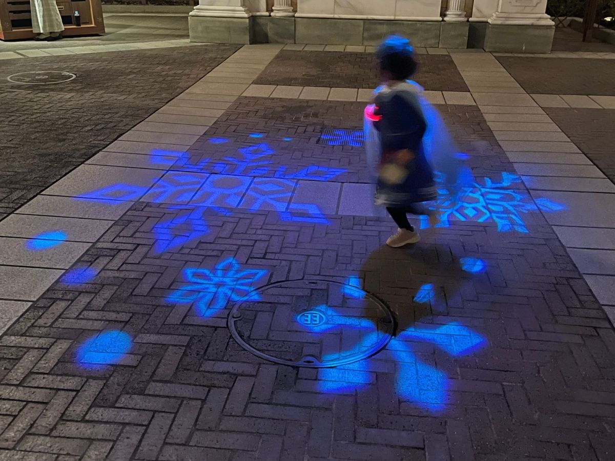 アメリカンウォーターフロントパークを囲むように置かれた小さなツリーがきらめき、フロアには雪の結晶の投映も。