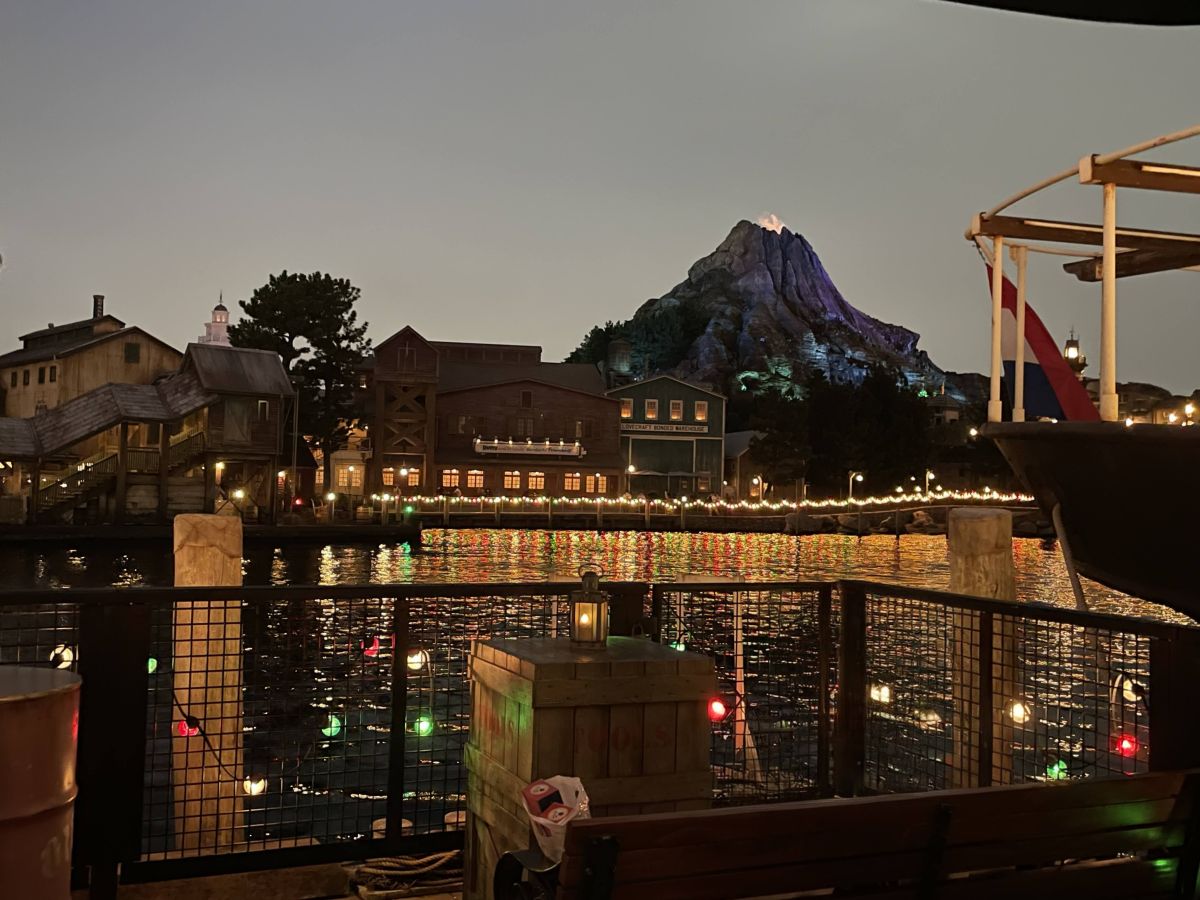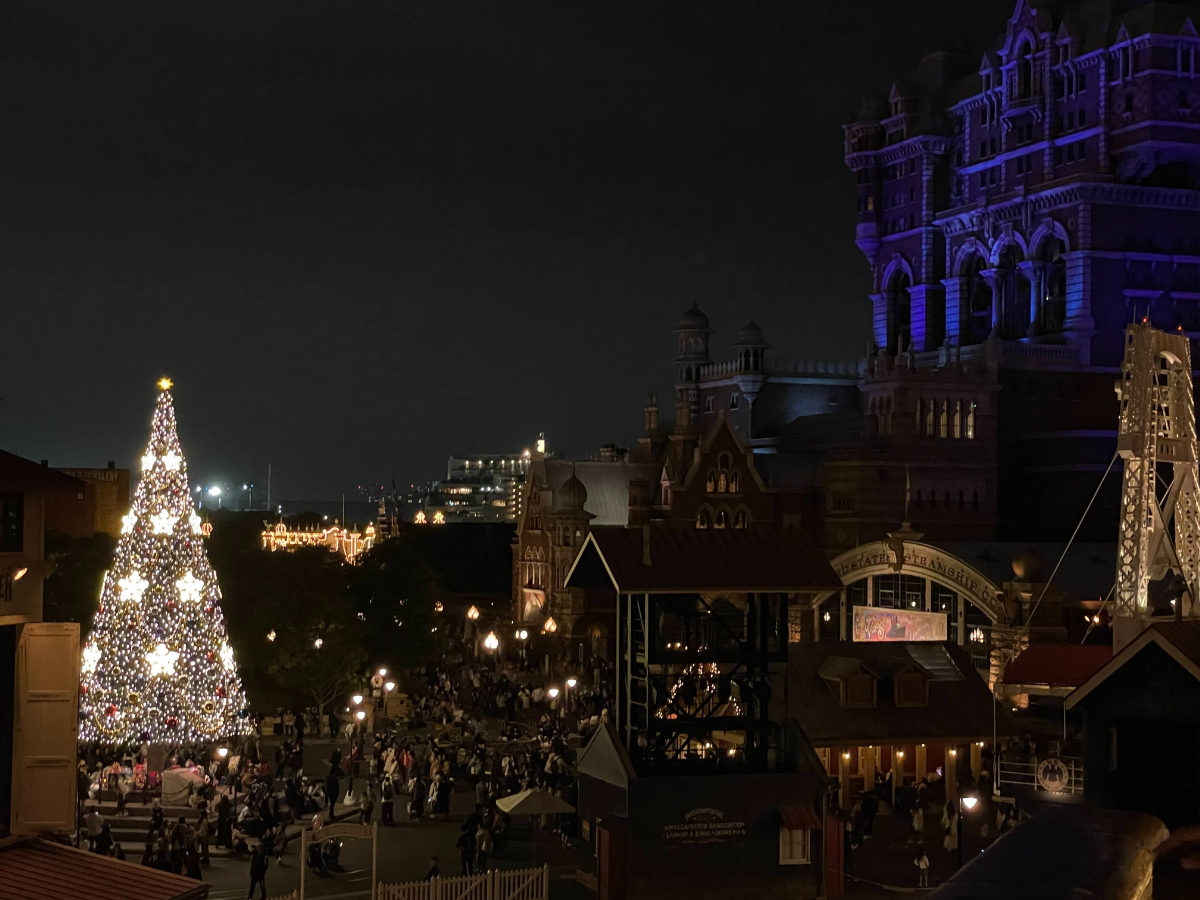 ここから眺める、東京ディズニーシー全体の景色は日中でもおすすめなんです。クリスマスシーズンはツリーも見られるので、日没後、光り輝く演出が加わるツリーを観賞するのに絶好のスポットですよ。