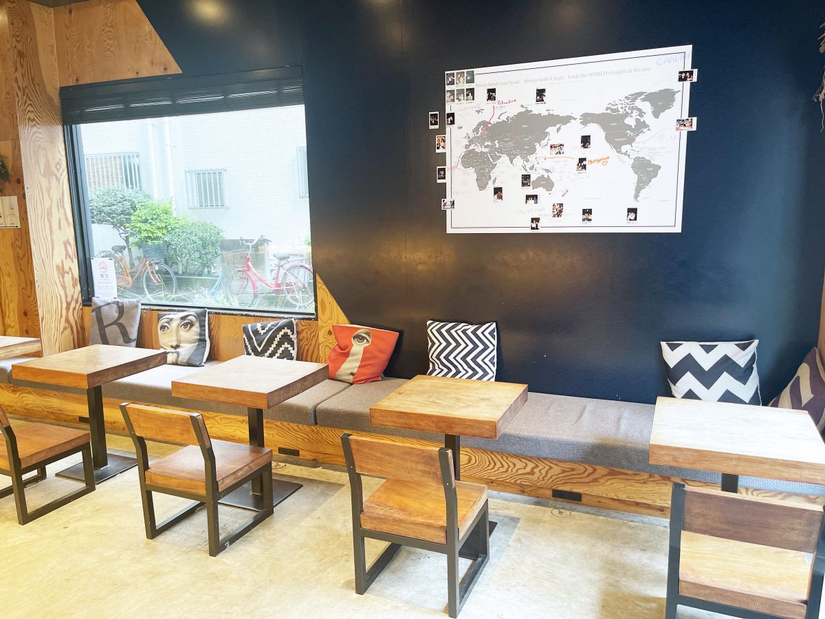 1階には、宿泊客が利用できるラウンジスペースが。Wi-Fi完備なのはもちろん、コンセントも用意されているので、コワーキングスペースとしても活用できます。