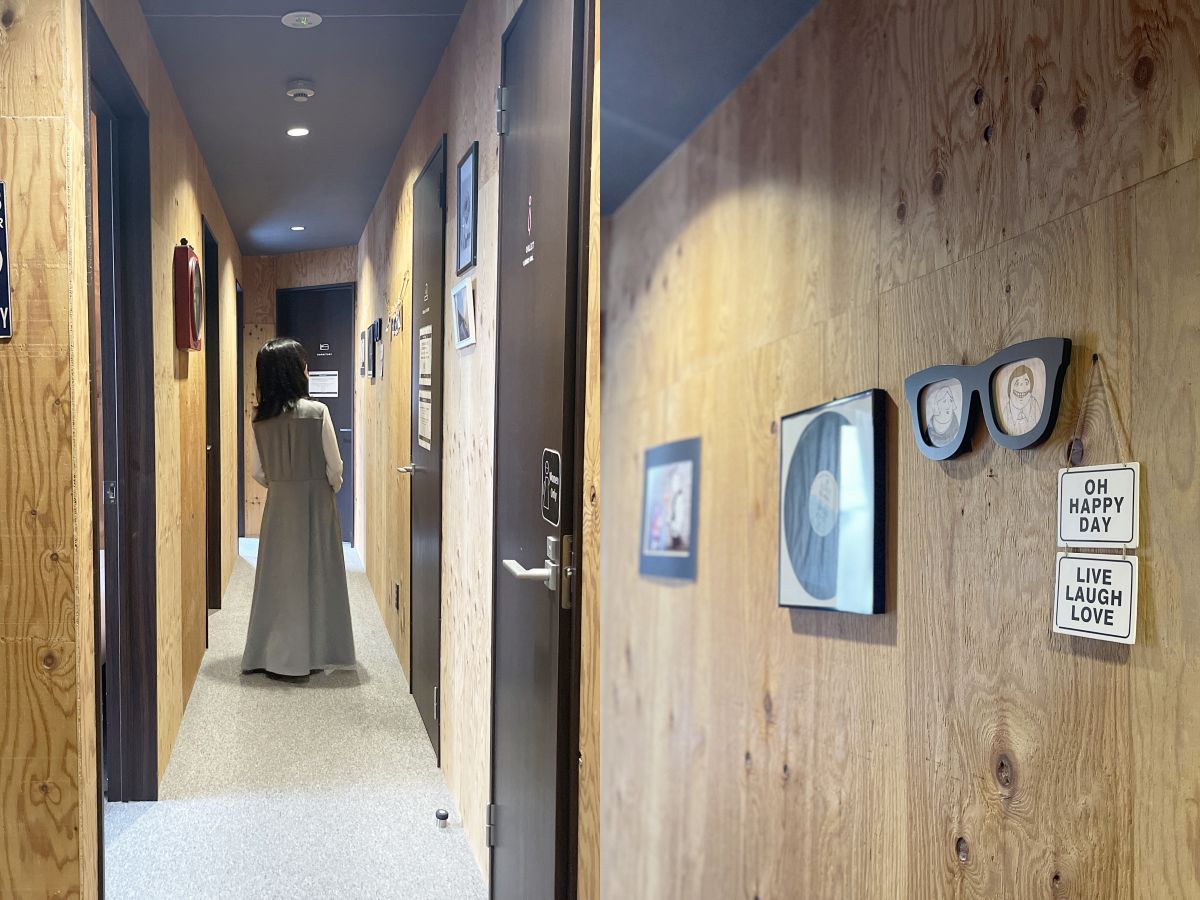客室とバスルームやシャワールームのある宿泊スペースも、ウッドを基調としたデザイン。廊下の壁には、さまざまなアート作品が飾られています。