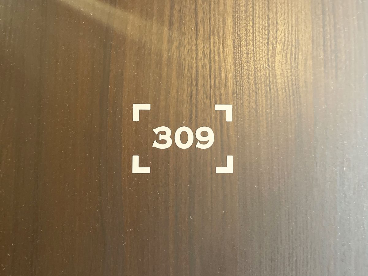 客室のドアには、「FOCUS」というホステルの名前に合わせて、カメラのフレームのようなあしらいが施されています。
