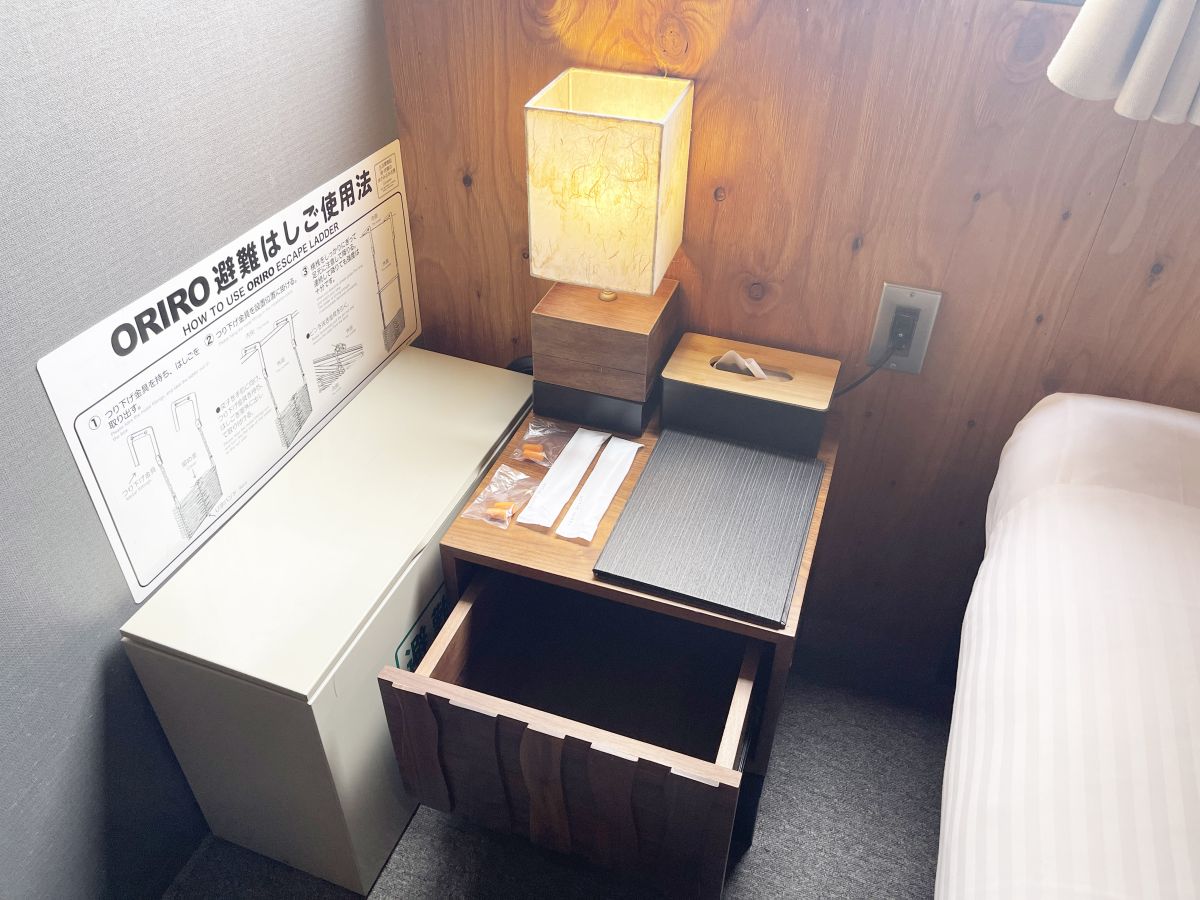 ベッドサイドは収納スペースにもなっています。深さや奥行きがあり大容量なので、長期滞在でも便利!