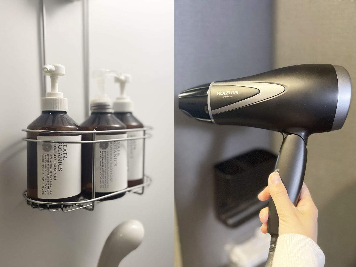 シャワールームのほかにも、各フロアにバスルームがあります。バスルームには、シャンプー・コンディショナー・ボディーソープに、ドライヤーも用意されています。