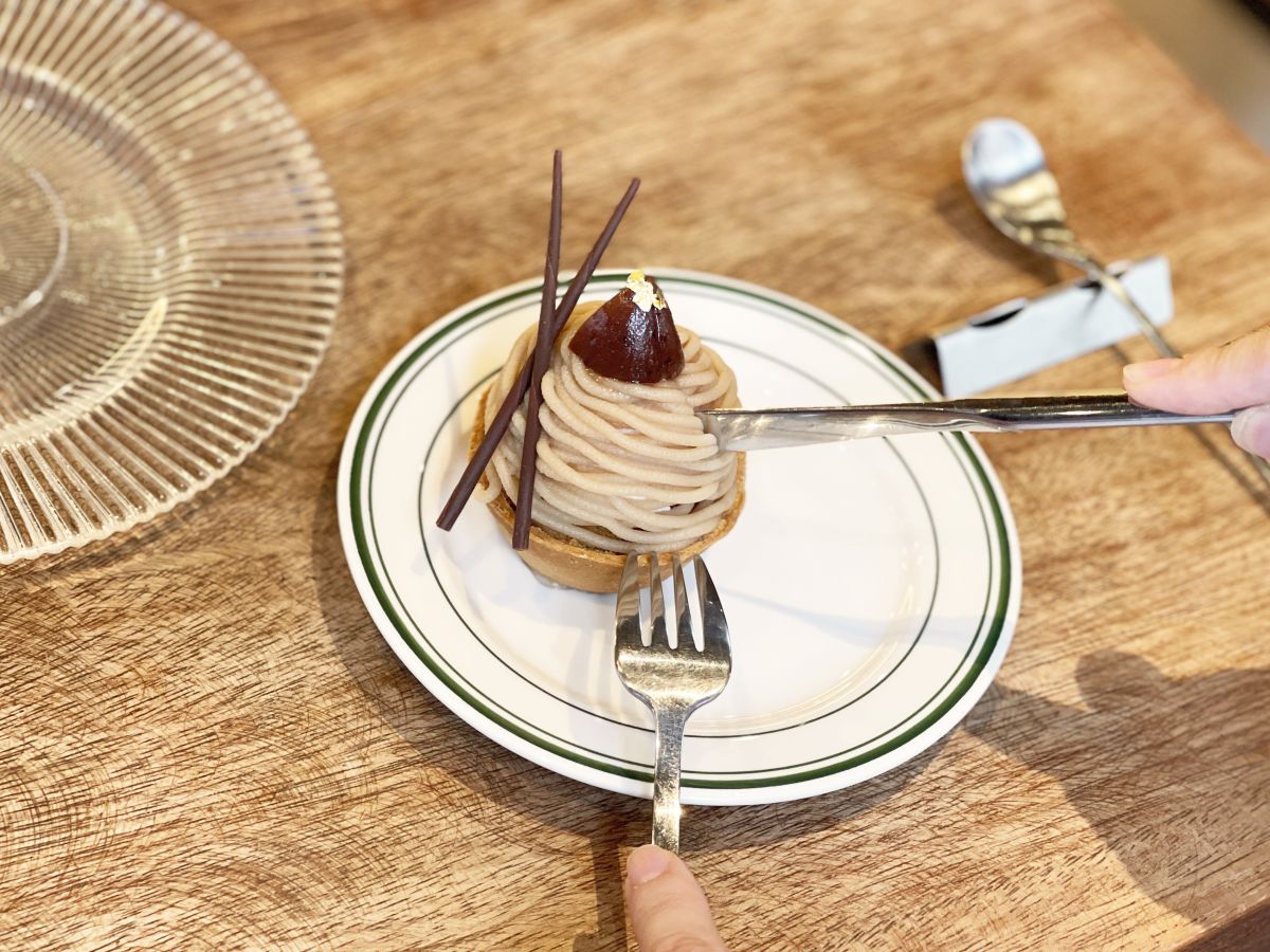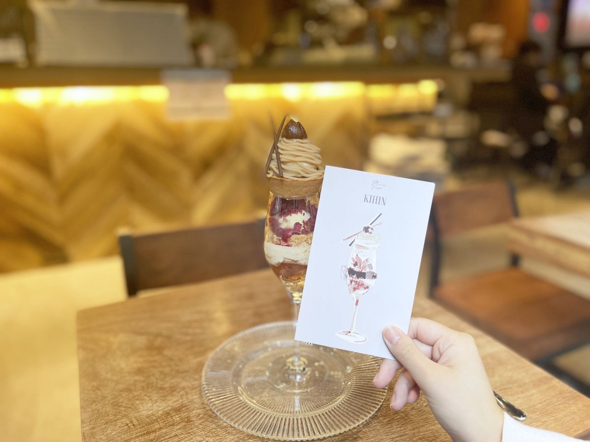 今回いただいたのは、グラスの上に大胆にモンブランがのった「-気品-和栗とりんごのパフェ」。パフェグラスの中には、アクセントとなるカシス味のグラニテや、まろやかなラムレーズンアイス、アールグレイタルトにシナモンリンゴなど、モンブランに合わせたさまざまな食材が使われています。