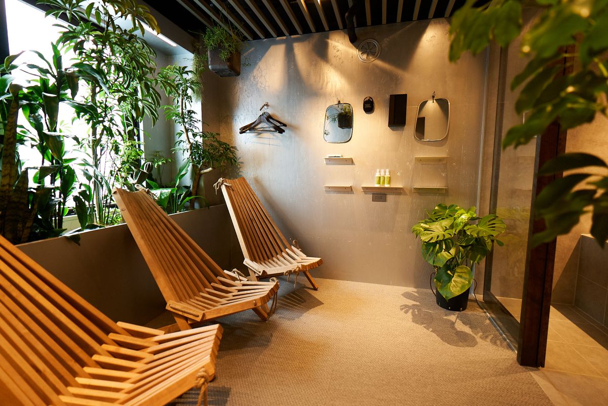 サウナは1室1〜3人まで完全貸切で、カップルやファミリーなどでも利用可能。サウナルームとシャワールームに、グリーンで囲まれた内気浴スペースもあるので、ゆったり、心地よくサウナを楽しめます。