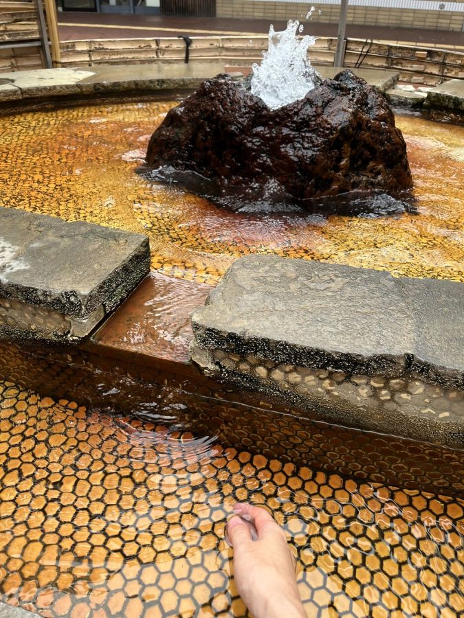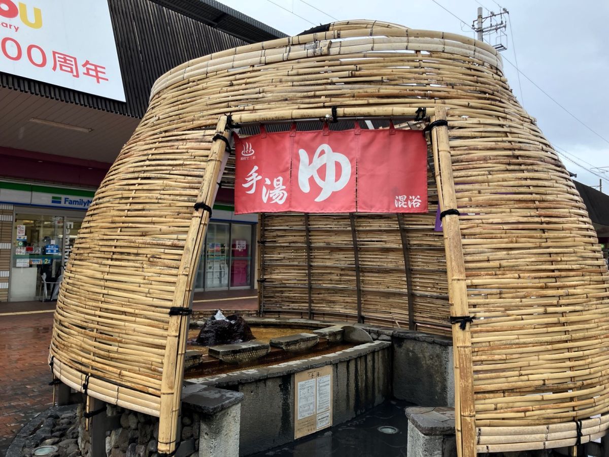 特急「いちろく」号の始発駅となるJR別府駅にやってきたら、駅前に竹で造られたドームが。なんと、足湯ならぬ“手湯”です! 別府といえば九州随一の温泉地、前日に温泉に浸かりましたが、出発前に手だけ温泉に浸かり、改札へ進みます。