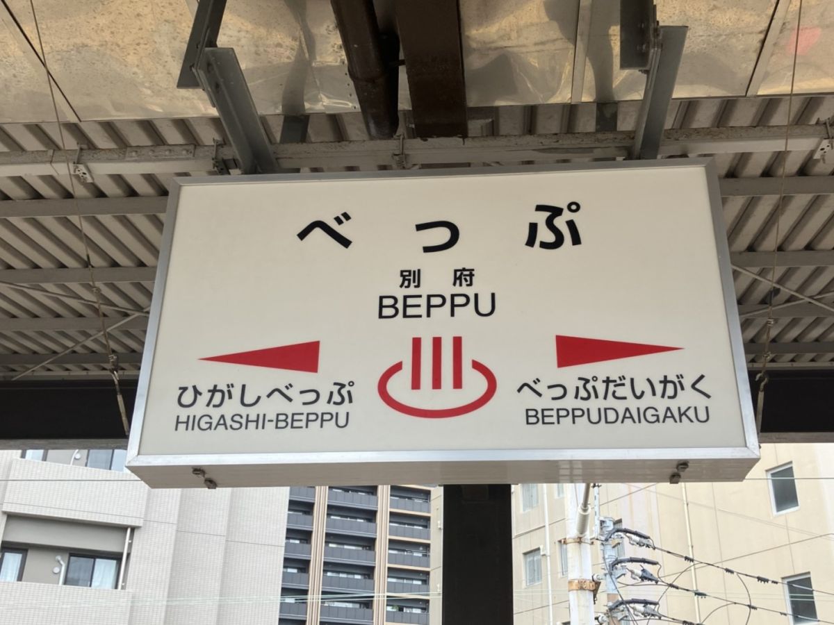 随所におんせん県らしい装飾のある別府駅のホームから「いちろく」号へ乗車し、博多までの列車旅にいよいよ出発です!