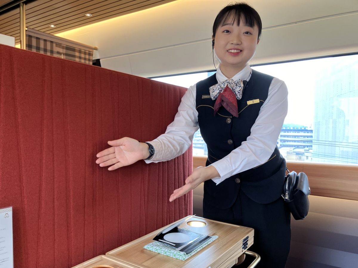 別府駅出発からほどなくして、各座席に客室乗務員さんがやってきて、ご挨拶と車内の案内をしてくれます。