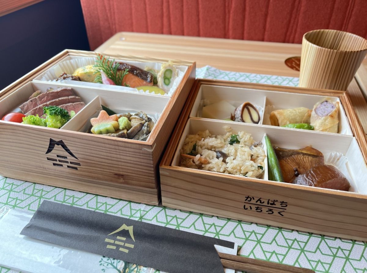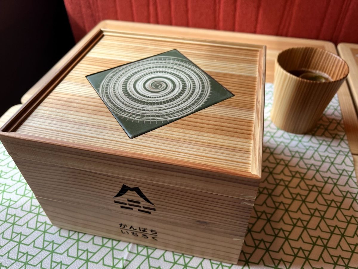 食事は日田杉で作られた2段のお重で提供され、蓋には福岡県の伝統工芸品“小石原焼”のタイルが使われています。