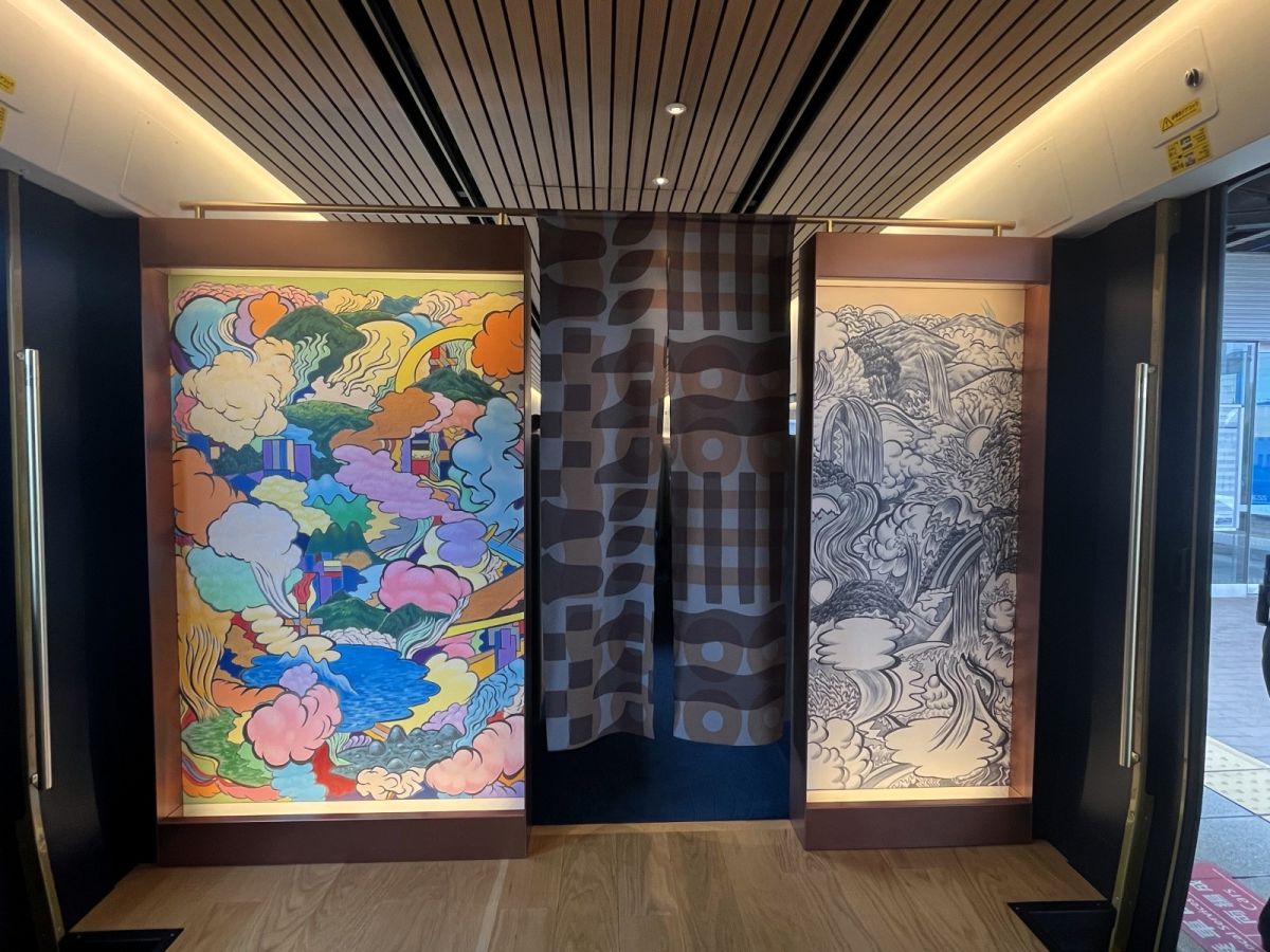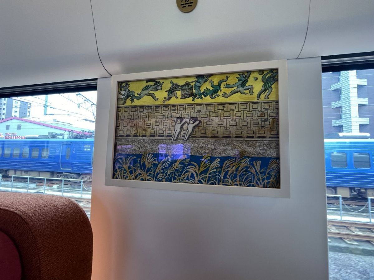 座席脇やドア付近など、車内のあちこちにアートが展示されているので、車内でアート鑑賞ができるんです! 各座席に置かれた車内販売の案内に載っている二次元コードを読み込むと、展示アートの詳細が見られるので、スマホを片手にアート鑑賞を楽しみます。