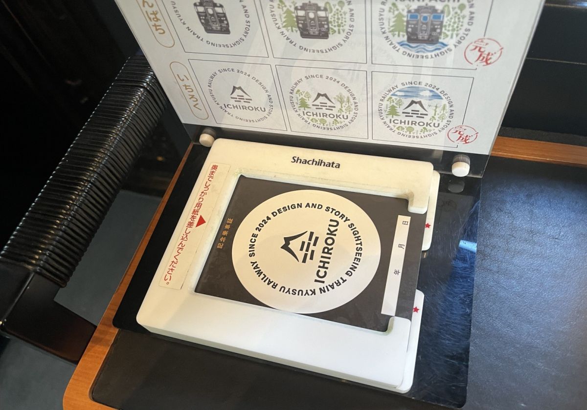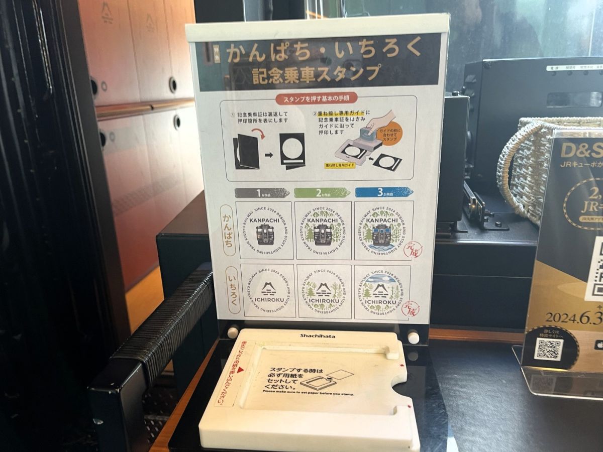 乗車記念のスタンプもあり、座席に設置された台紙を持ってスタンプ台へ。手順通りにガイドに台紙をセットし、1から順番にスタンプを押すと完成! 乗車の楽しい思い出になりました。