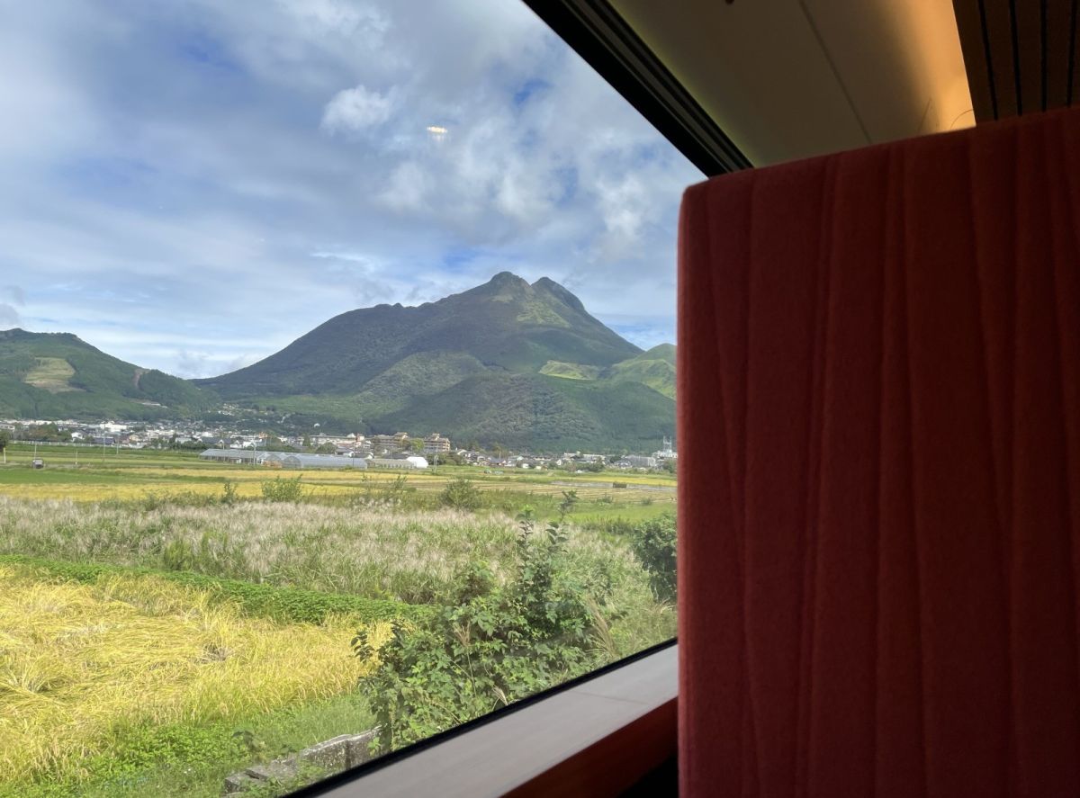 もちろん、車窓から見える景色も列車旅の楽しみの一つ。食事をゆっくりと味わっていたら、由布岳が見えました!