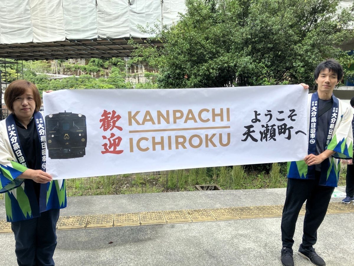 1カ所目のおもてなし駅に到着です。大分県日田市にある天ケ瀬駅で約9分停車するので、ホームに降りて地元の方々のおもてなしを受けます。