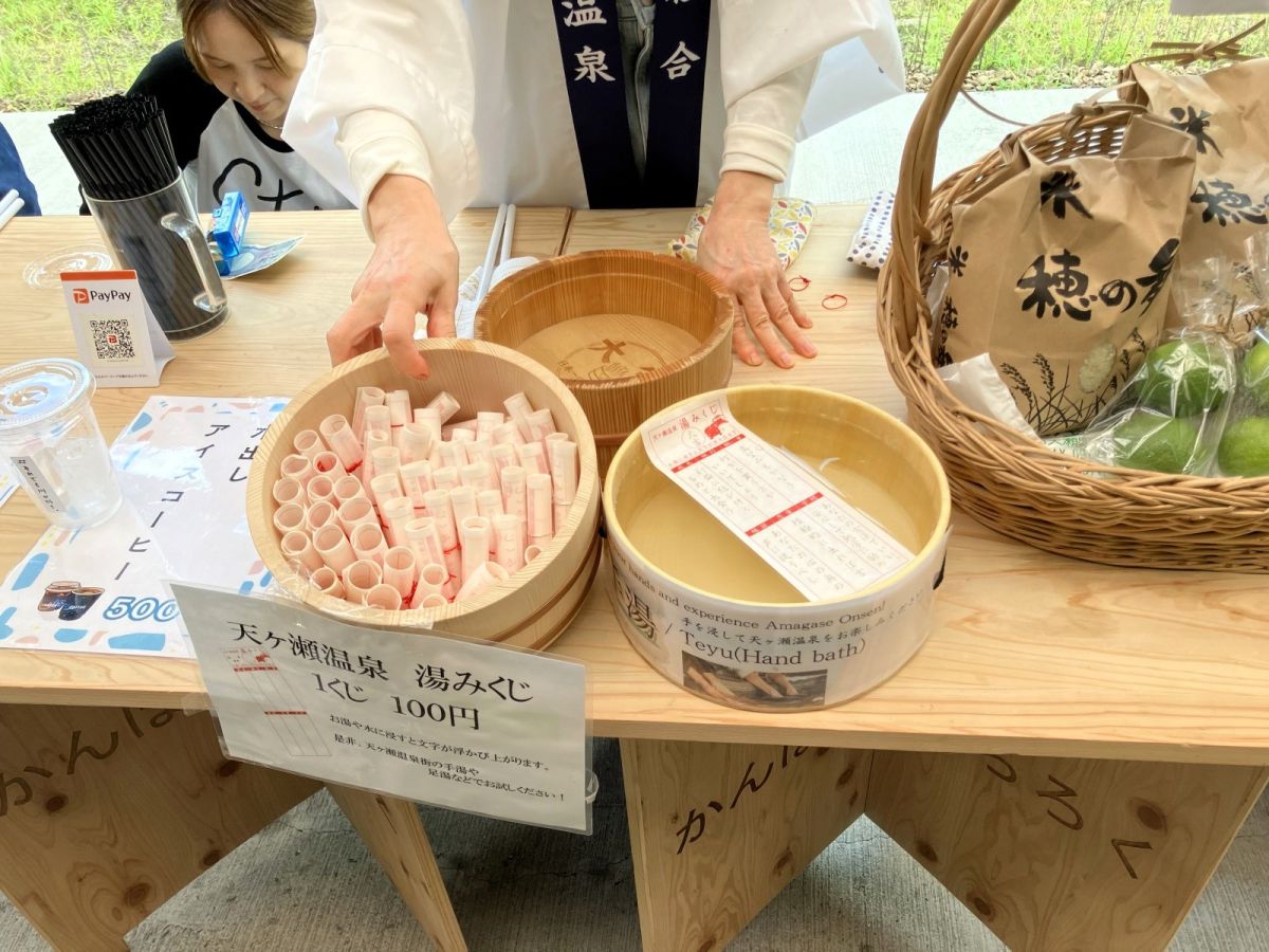 横断幕で迎えられ、地元の特産品の販売や、お湯につけると文字が浮かびあがる湯みくじなどが用意されていました。発車時間まで地元の方たちとふれあい、発車時間の鐘が鳴ったら車内に戻ります。