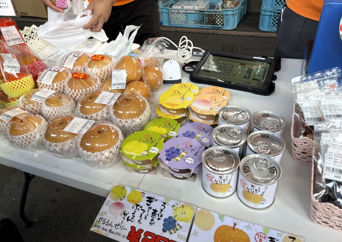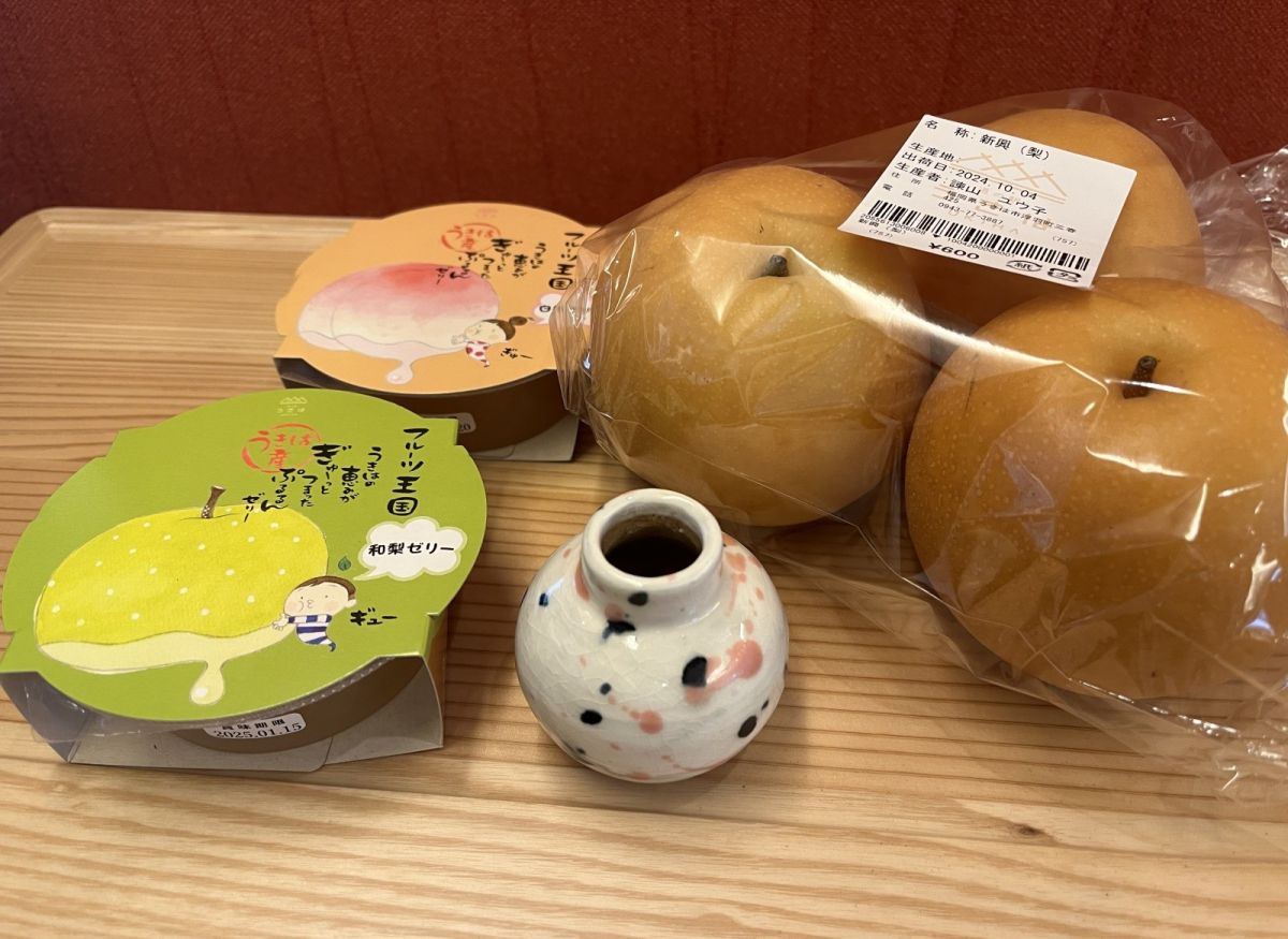 うきは駅にはちょうど旬の梨や、フルーツゼリー、お酒、雑貨類など、バラエティー豊かに出店していました。