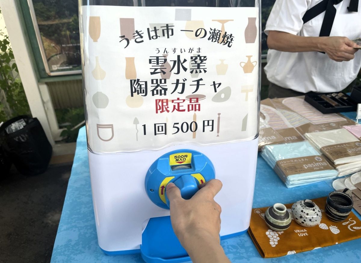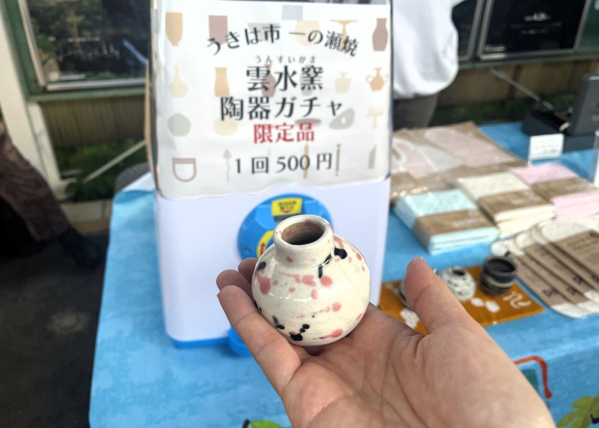 なんと、うきは市の窯元が作る「雲水窯陶器ガチャ」。500円を入れて、どんな陶器が出てくるのかとワクワクしながらハンドルを回すと、ピンク×ブラックの模様がかわいらしいミニサイズの花瓶が出てきました!