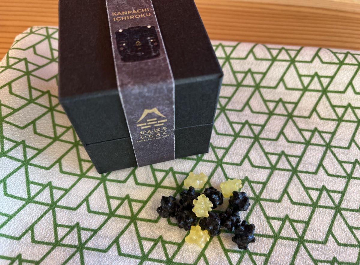 車内販売で「かんぱち・いちろく」グッズをおみやげに購入します。ブラックとイエローで車体イメージそのままの「オリジナル金平糖」600円、「クリアファイル」500円は手軽で、おみやげにピッタリです。