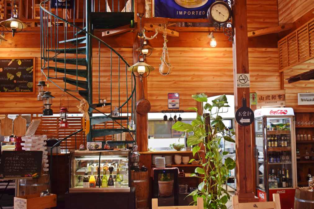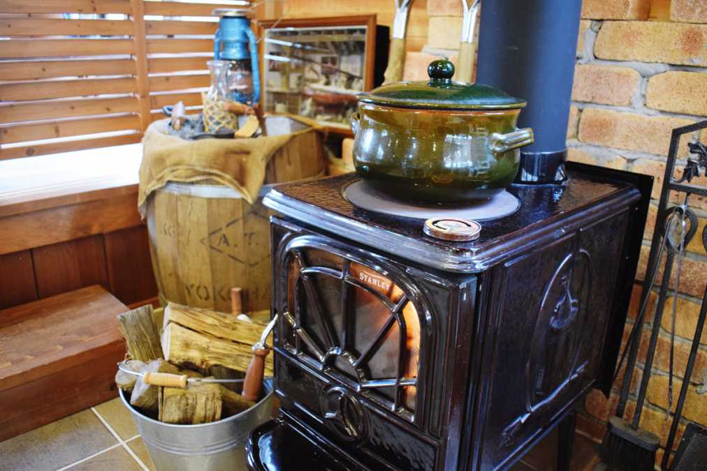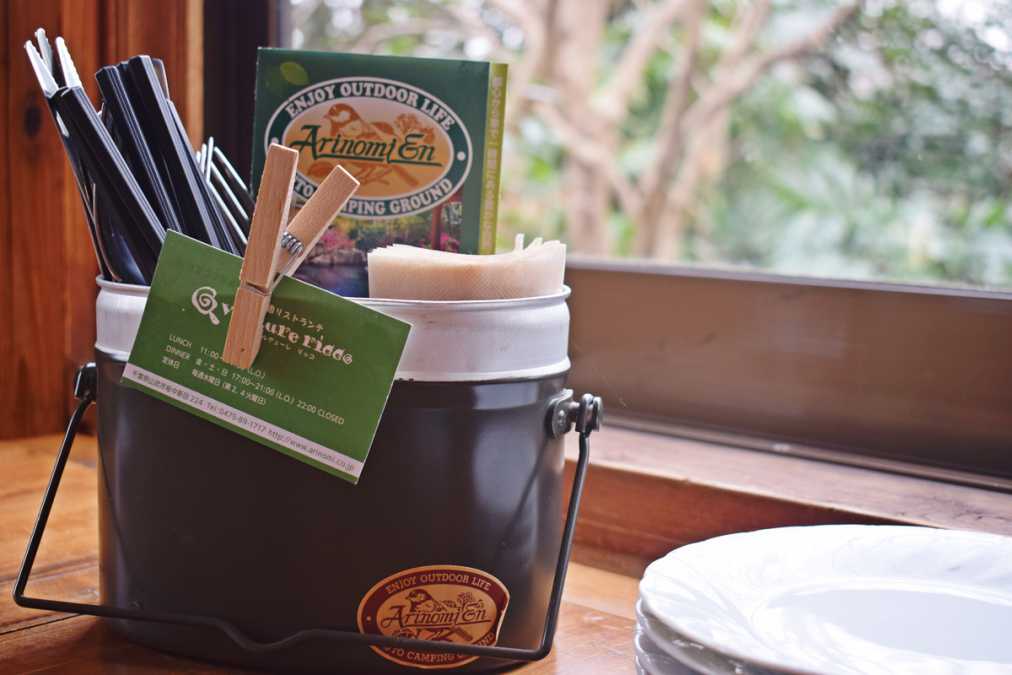 山小屋風の店内は、木のぬくもりが感じられる空間。併設されているキャンプ場には、季節を問わずアウトドア好きが遊びにくるためか、店内にもアウトドアグッズがそこかしこに配置されています。薪ストーブや飯盒を使ったカトラリー入れもおしゃれ!