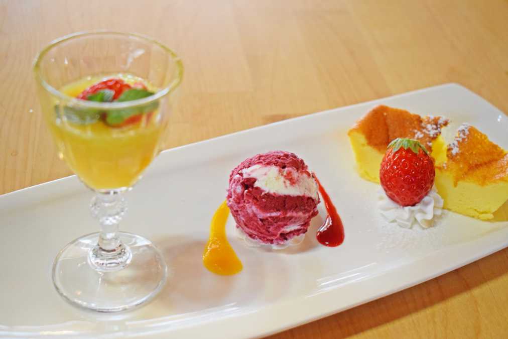 ランチメニューは「本日のriccoランチ(1850円)」、「スキレットランチ(2500円~)」、「山武黒毛和牛サーロインステーキランチ(4000円~)」の3コース。前菜・メイン・デザート・ドリンクがセットで、パスタとスキレットは、その日の野菜に応じた日替わりメニューになっています。