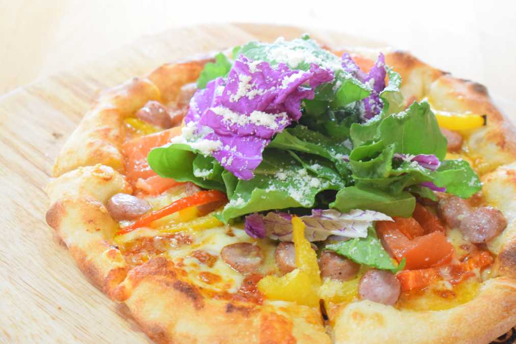 横芝大木式ソーセージのミックスピッツァ(単品1300円)は野菜たっぷりで見た目もカラフル!