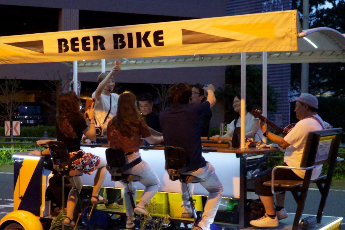 ビアバイクとはオランダ発祥の乗り物で、ビールを飲みながらペダルをこいで走る移動式ビアカウンター。6人の乗客が一人一人ペダルをこぎ、それを動力として、先頭のドライバーが運転し、実証実験を重ねて安全性の確認を行い、所定の許可を得て公道を走っています。