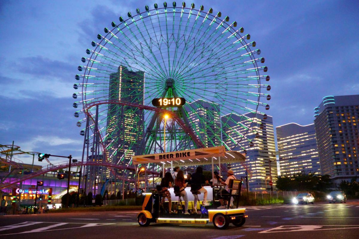 ビアバイクが走るのは、大観覧車やロープウェイ、ビル群の夜景がきらめく、みなとみらいエリア。ガイドさんのトークや生演奏もあり、ライブのような一体感が味わえます。