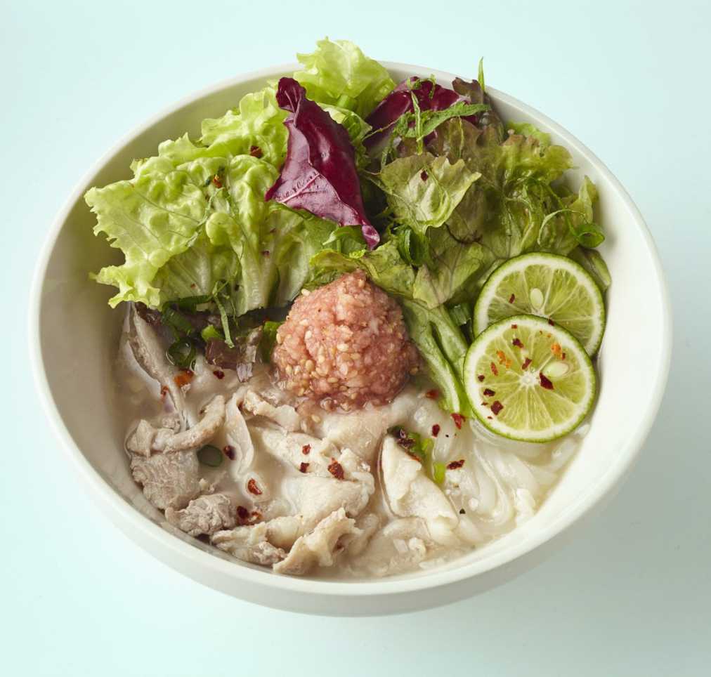 自家製フォースープの中に溶け込んでいるのはなんと甘酒!新感覚の「サラダフォー 塩麹豚と梅おろしのフォー 甘酒仕立て」950円。塩麹豚と梅おろしの相性も抜群のヘルシーメニューです。