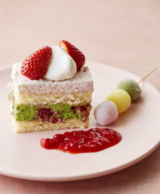 味わいも甘酸っぱく春のよそおい。パステルカラーの色使いでお皿の上が華やぎます!「抹茶とイチゴのショートケーキwith3色団子」734円。