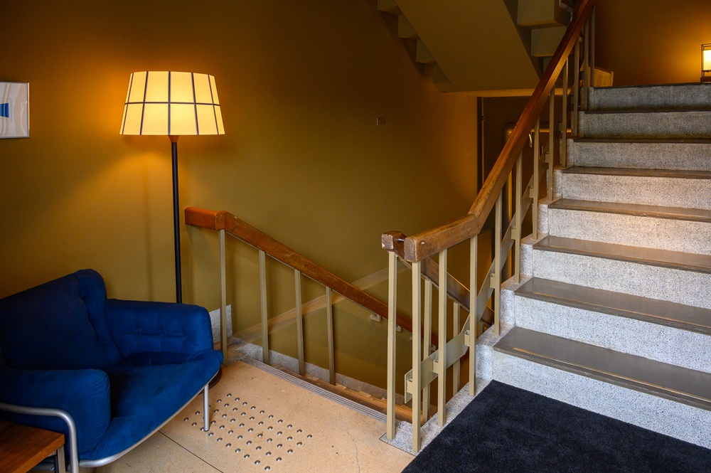 旧北陸会館の名残は、客室だけでなく建物の随所に見られます。1階エントランスから地下に向かう階段の手すりや、コンクリート削り出しの床は手を加えずそのまま残されています。年数を経たからこその味わいや、現代では再現不可能とも言われる往時の職人の高度な技にふれられるのも、リノベーションホテルの醍醐味です。