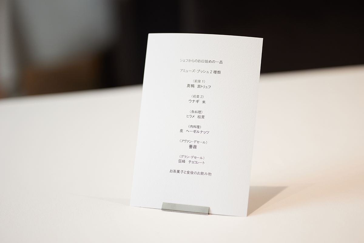 取材時のディナーコースは、「シェフからのお口始めの一品」、「アミューズ・ブッシュ2種類」、前菜の「真鴨 黒トリュフ」、前菜の「ウナギ 米」、魚料理の「ヒラメ 松茸」、お口直しの「オッソー・イラティ ルッコラ」、肉料理の「鹿 ヘーゼルナッツ」、アヴァン・デセールの「薔薇」、グラン・デセールの「巨峰 チョコレート」、「お茶菓子と食後のお飲み物」という内容。
