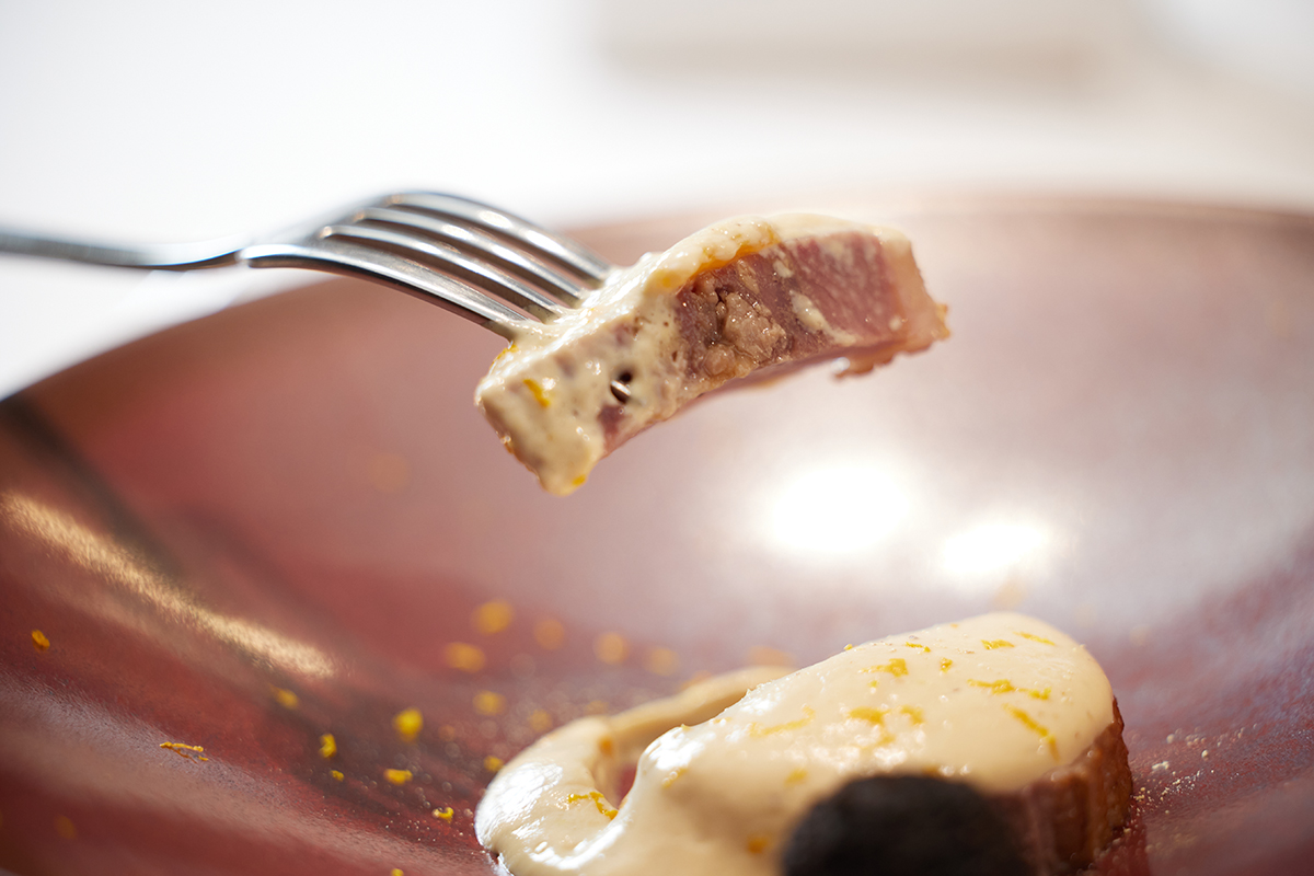付け合わせ兼ソースでもある「ベージュ色のパフェ仕立て」は、ナスのピューレの内側にヘーゼルナッツと焦がしバターのソースが流し込まれ、その上に、フォアグラやフライドオニオン風味のクルトン、ヨーロッパ産のキノコの一種であるジロール茸、シナモンやクローブ風味のホイップクリームが飾り付けられています。