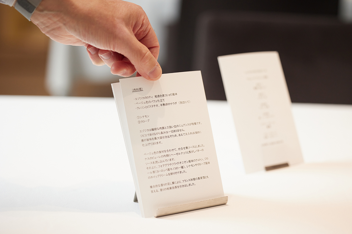 このカードを置くタイミングがポイントで、料理を提供する前に置くことで、次に出てくる料理への期待感を高めてほしいという思いがあるそうです。