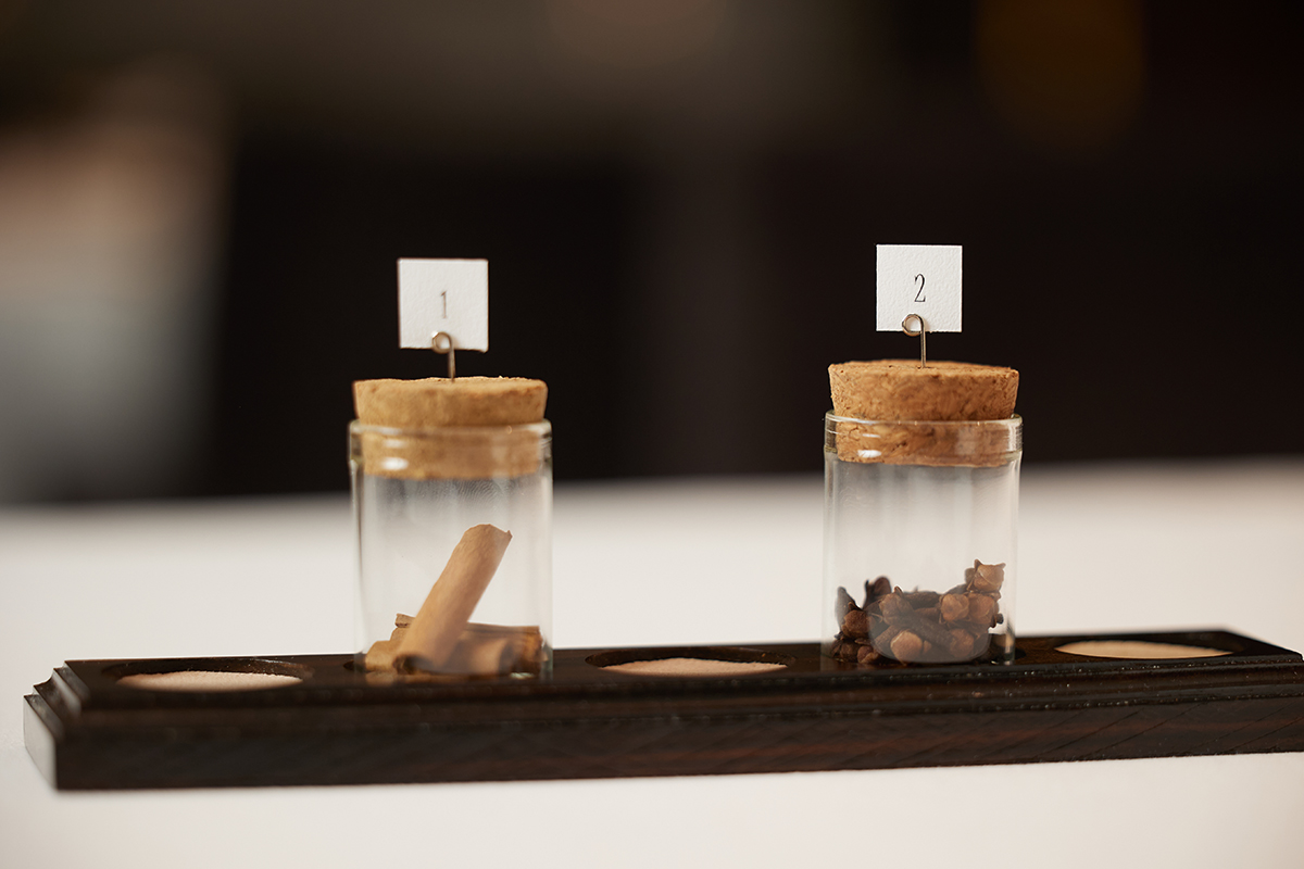 1はシナモン、2はクローブ。名前を聞いたことのある香辛料でも、具体的な香りとなると想像できないことも多いのでは? だからこそ「Takumi」では、実際に香辛料の香りを嗅いで、次に提供される料理への想像を膨らませる、味を「体感」できるような工夫がされています(こちらは食べることはできません)。