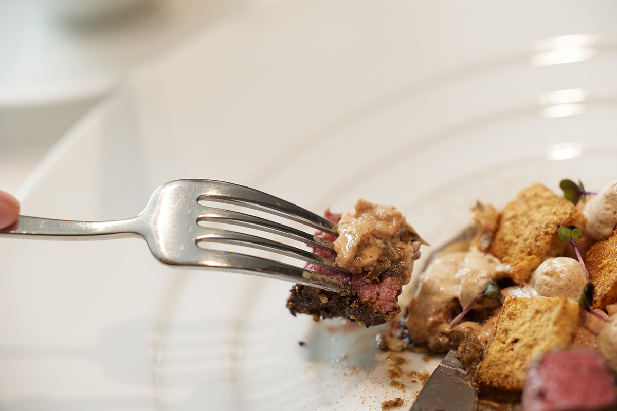 付け合わせは、キノコを練り込んだジャガイモピューレに黒トリュフをまぶしたもの。見た目は黒トリュフのようでも食べると全然違う、ユニークな一品です。