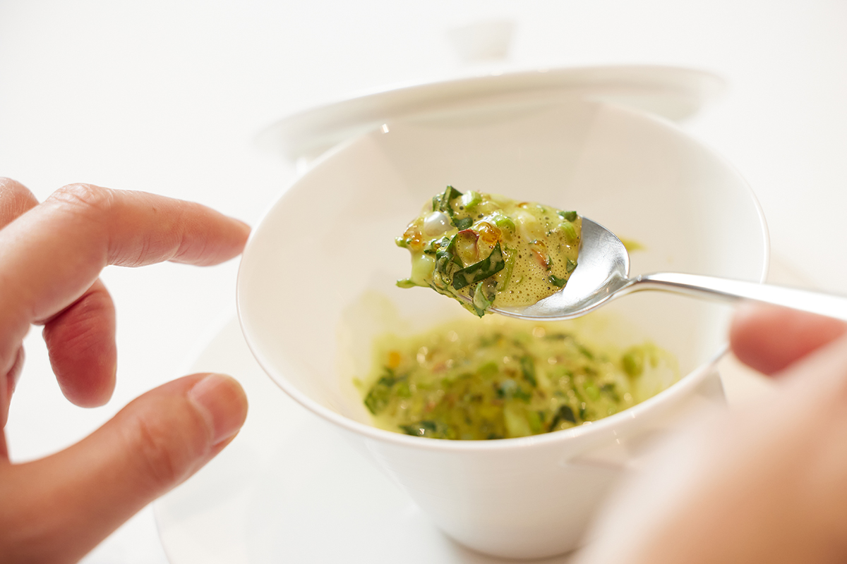「これがサラダ!?」と思いながら食べ方をシェフに聞いてみると、これはよくかき混ぜた状態でいただくのだとか。かき混ぜるとそれぞれの食材がふわふわとメレンゲ状に。本当にサラダ?と思いつつと口に入れると、味わいはサラダそのもので、口の中でゆっくりととろけました。サラダで野菜のうま味を感じたのは、初めて!