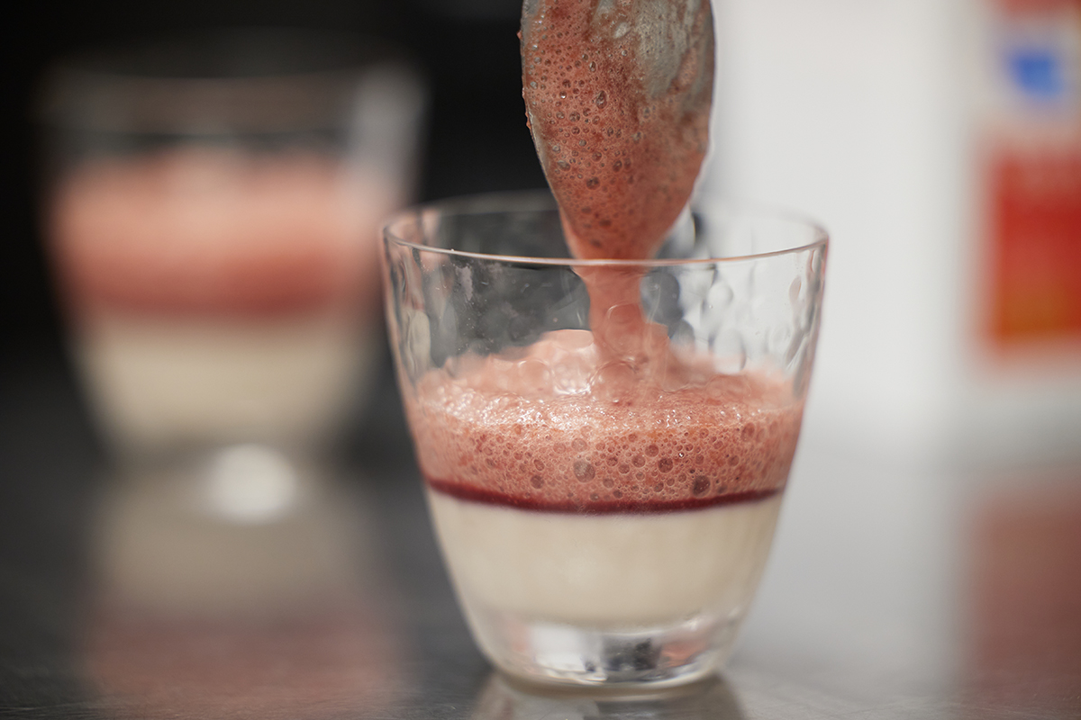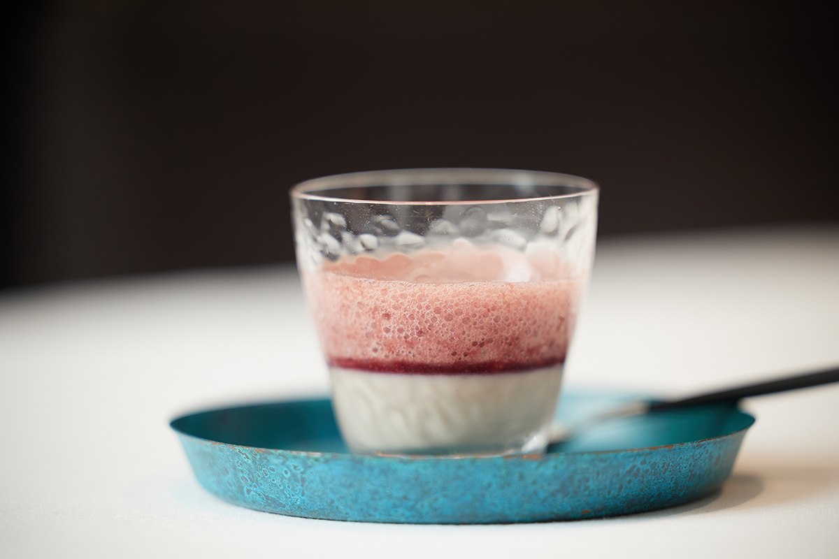 フワフワのムースの食感も楽しく、バラの香りがほんのりと口の中いっぱいに広がります。これは、何度も食べたくなる味! 下には牛乳で作ったプリンであるブランマンジェ、間の濃いピンクの部分にはバラのソースが入っています。