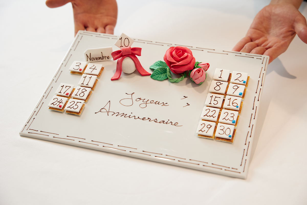 アニバーサリープレート(1210円)をオーダーすると、食事が終わったあとにこちらのプレートが運ばれてきます。美しいデザートのようなプレートですが、これはオブジェで食べることができないのでご注意を! 誕生日や恋人との記念日のお祝いで利用されることが多いこちらのプレート。カレンダー仕様になっているので、思い出の日付をここに刻みつつ、記念撮影をすることができます。