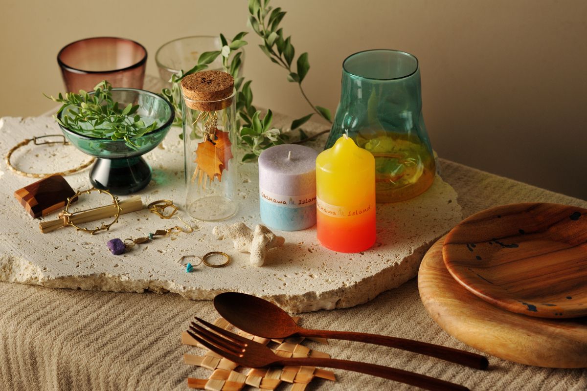 「夜あかりマルシェ」では、沖縄の⾃然や⽂化を⼤切にするクラフト作家が集い、海をモチーフにしたキャンドルや⽊⼯のランプシェードに沖縄ゆかりの⾦細⼯など、ぬくもりある作品が並びます。